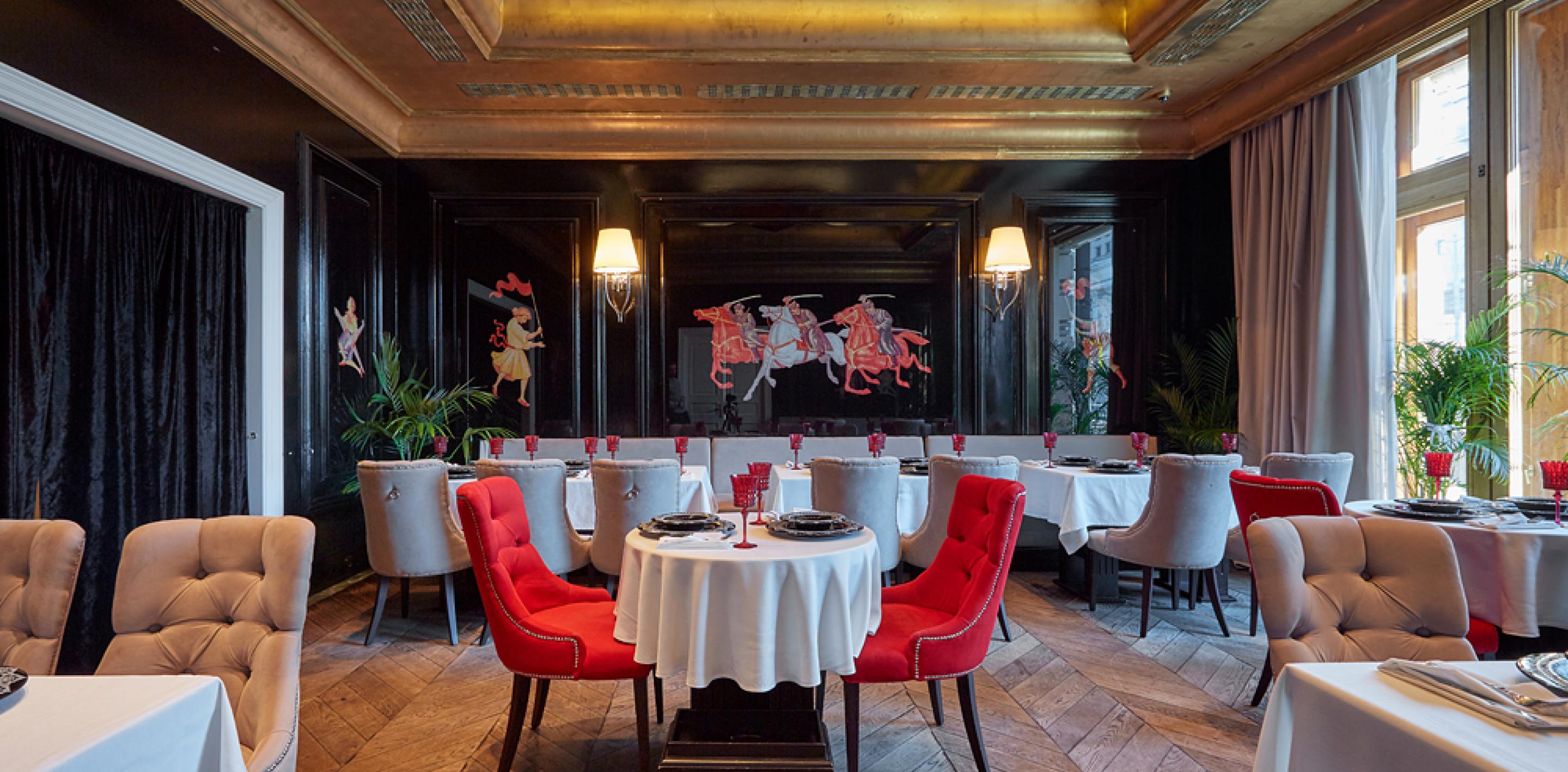Дизайнеры украсили ресторан работами советских художников XXвека: Малевича, Петрова-Водкина, Дейнеки, Самохвалова. Картины, мозаика на потолке, статуи и статуэтки с легкой иронией расставляют на основном белоснежном парадном фоне яркие цветовые акценты. Дальний камерный зал, наоборот, похож на палехскую шкатулку, вот только на черных лаковых стенах несутся вперед красные кавалеристы, а на золотом потолке светится рубиновая звезда