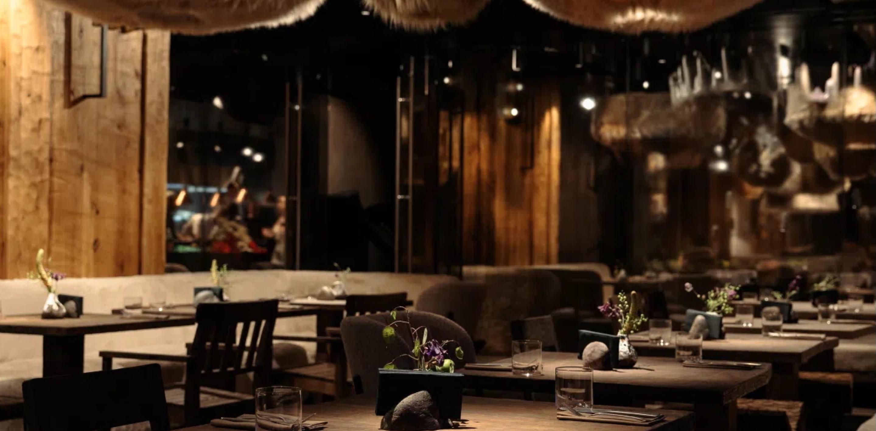 Ключевые для Manul блюда — простые, домашние: голубцы, щи-борщи, пельмени, пирожки. Кажущаяся простота здесь обманчива. Староверские пирожки с капустой — не привычного кисло-сладкого вкуса, а архаичного кисло-соленого, потому что делаются со щаницей. Жареные во фритюре бурятские пирожки хуужуры с бараниной и ливером еще древнее. А вот рыбный пирог с соусом из одуванчиков — современный вариант кулебяки в сладком сметанном тесте с фаршем из чавычи и нельмы и каперсами из одуванчиков. Дизайнер Наталья Белоногова вдохновилась темной гладью Енисея. Игра света и отражений нашли свое место в сияющем чернотой потолке и стеклянной перегородке с зеркальным градиентом. Первобытная сила Сибири проявилась в грубой текстуре дерева, шаманских бусах декора, образах минеральных окаменелостей, использованных в оформлении зала. В глаза бросаются люстры из искусственного материала — они одновременно напоминают и свертки сахарной ваты, и вязанные из ангорской шерсти шапки, популярные в нулевых.