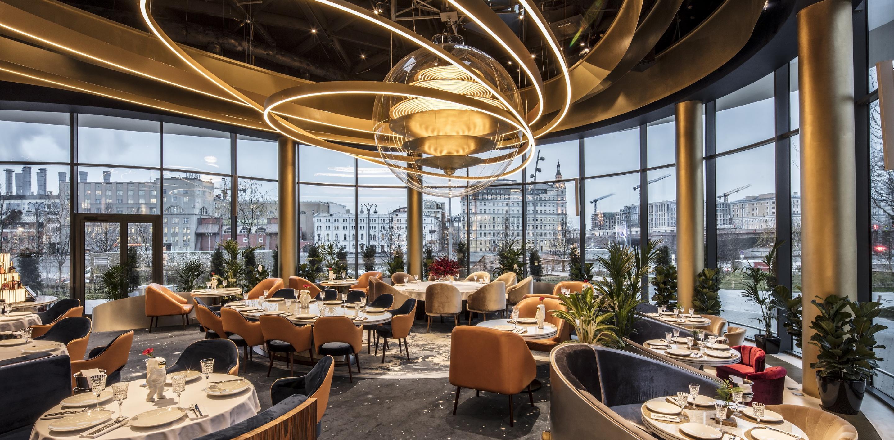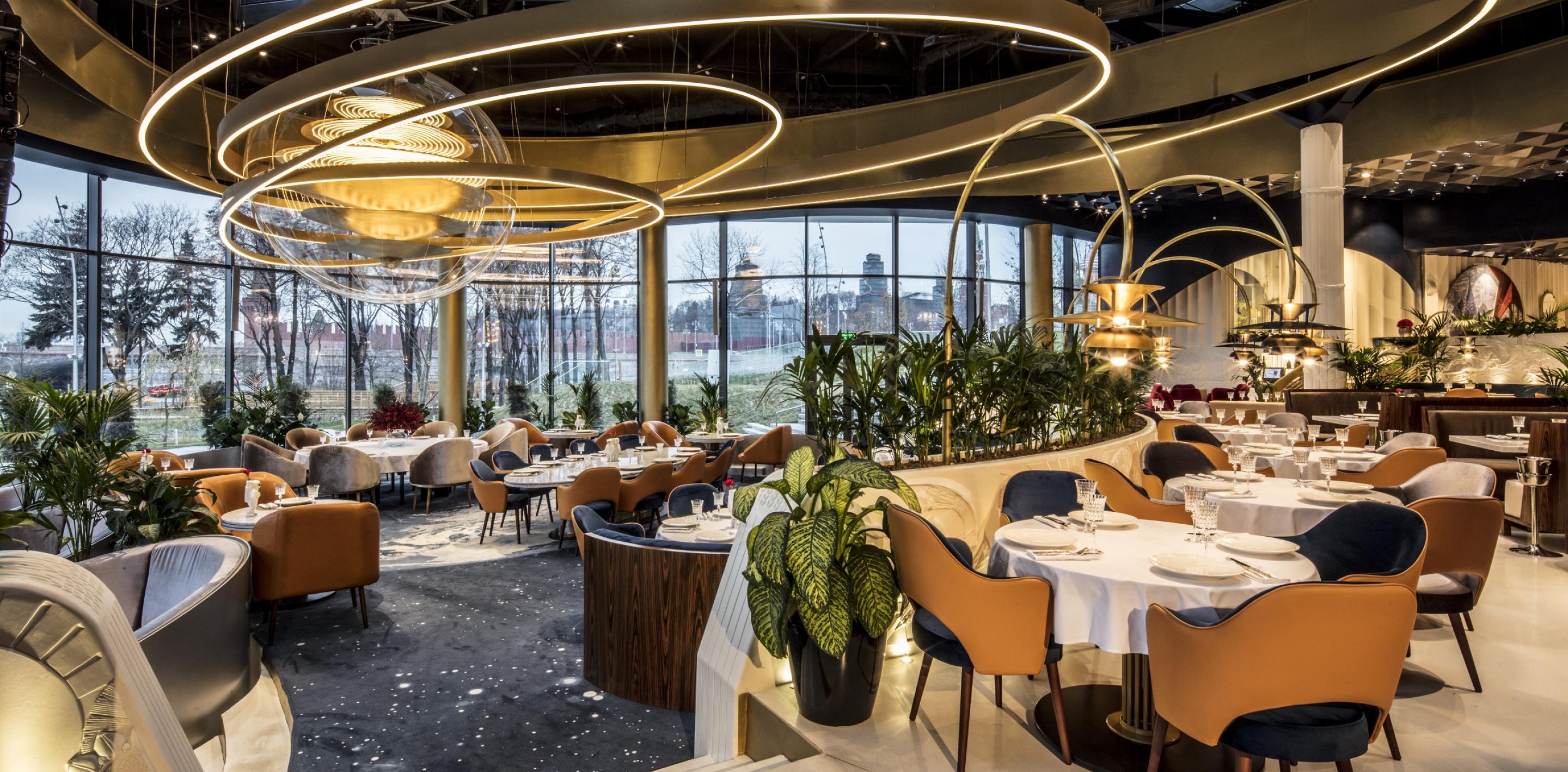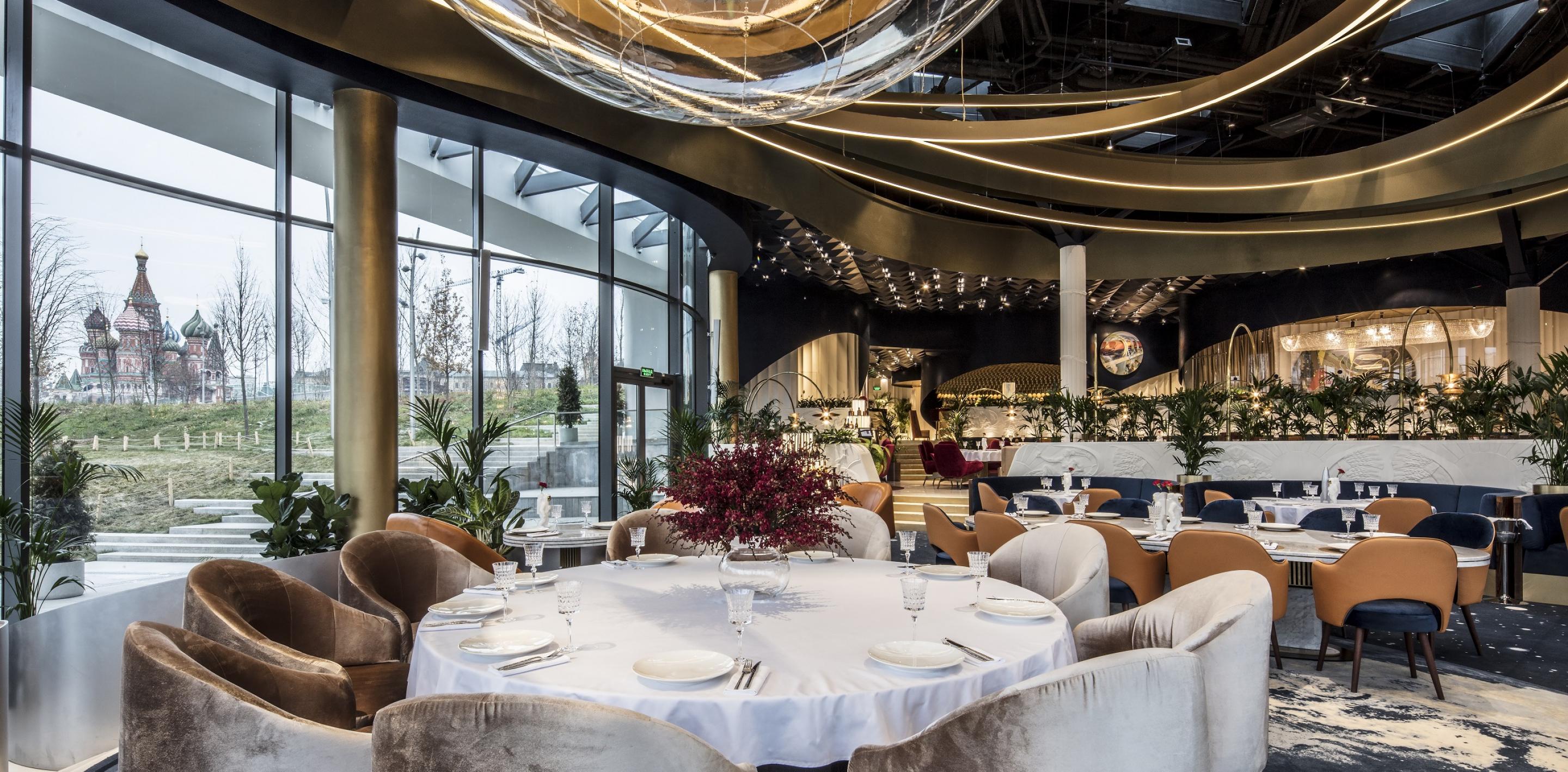 В интерьере воплощены мысли человека 60-х годов о наших днях, а за окном – зеленая, зеленая трава уникального ландшафта парка «зарядье» и панорамный вид на кремль и васильевский спуск.