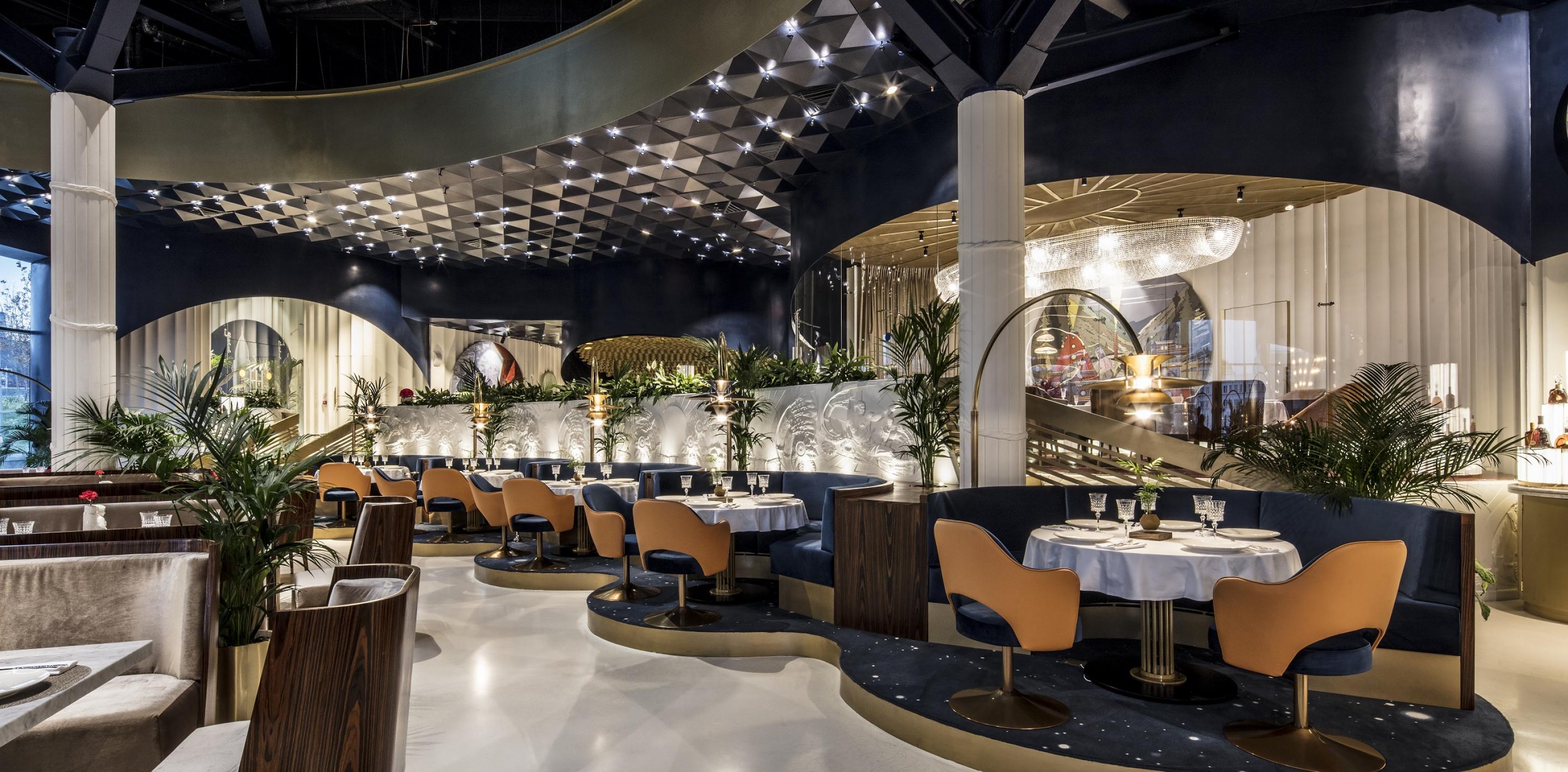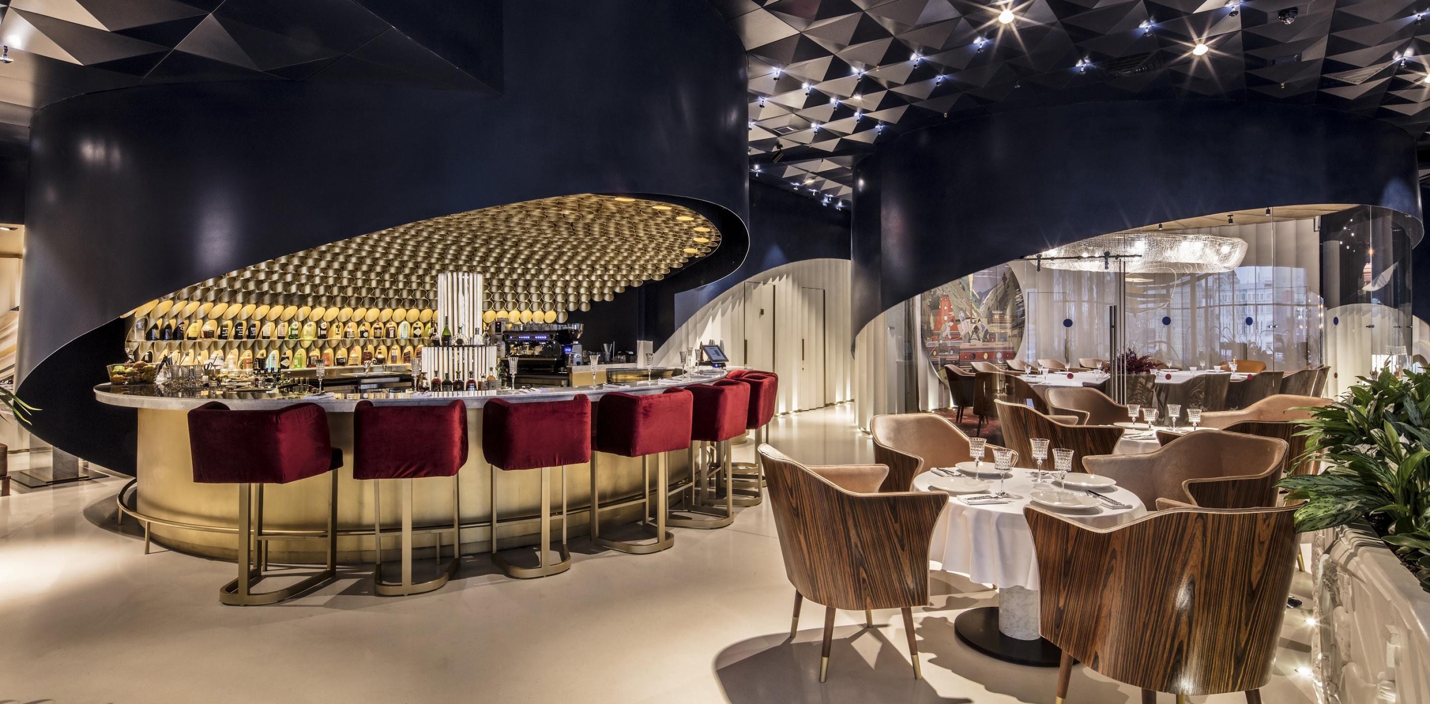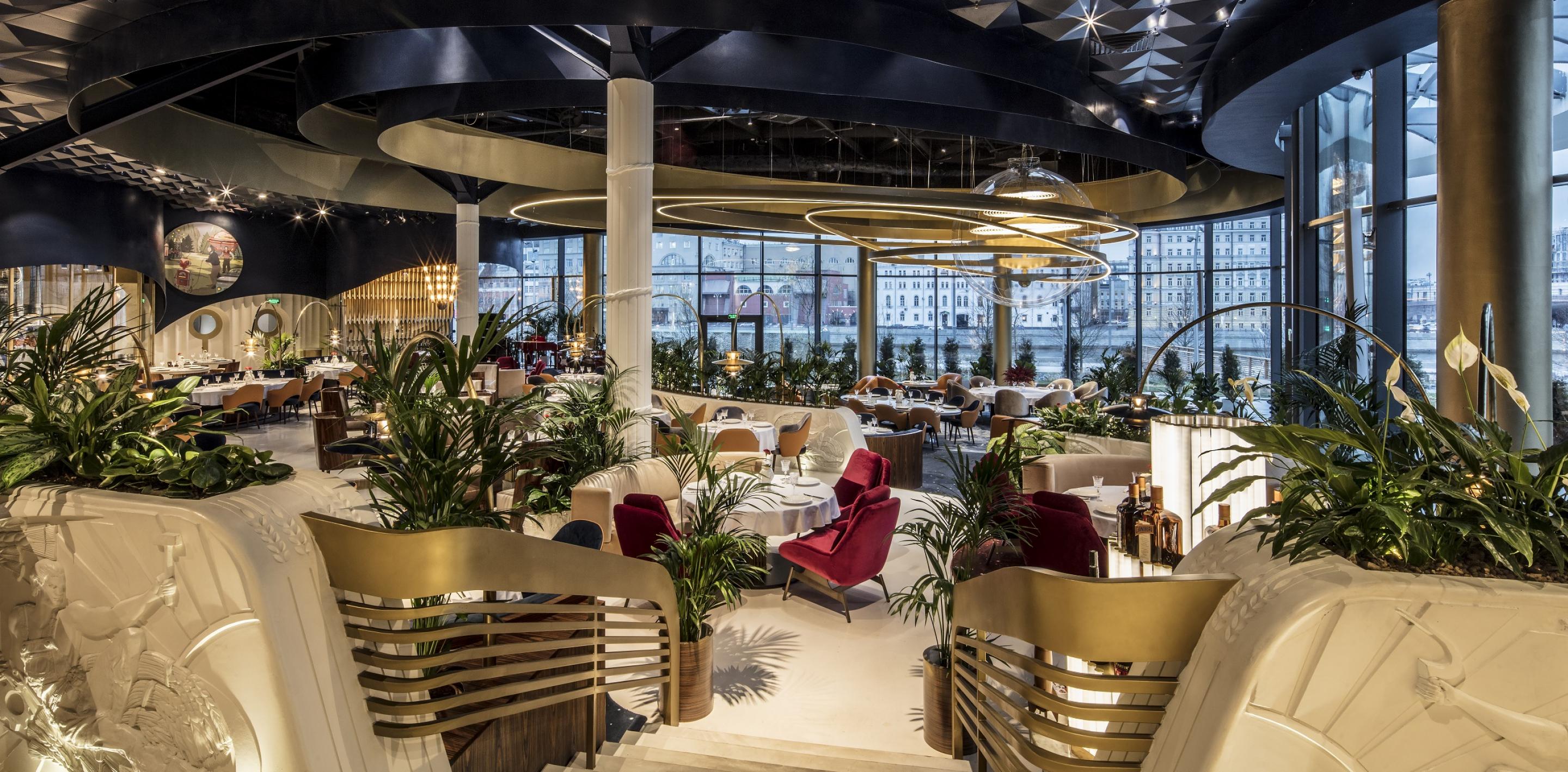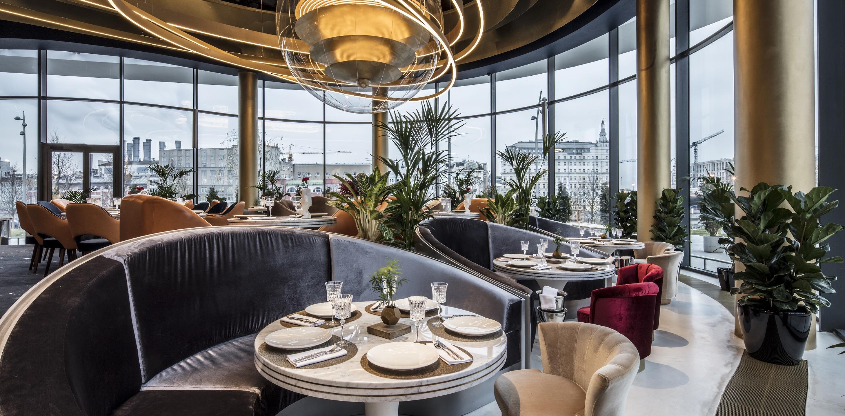 В интерьере воплощены мысли человека 60-х годов о наших днях, а за окном – зеленая, зеленая трава уникального ландшафта парка «зарядье» и панорамный вид на кремль и васильевский спуск.
